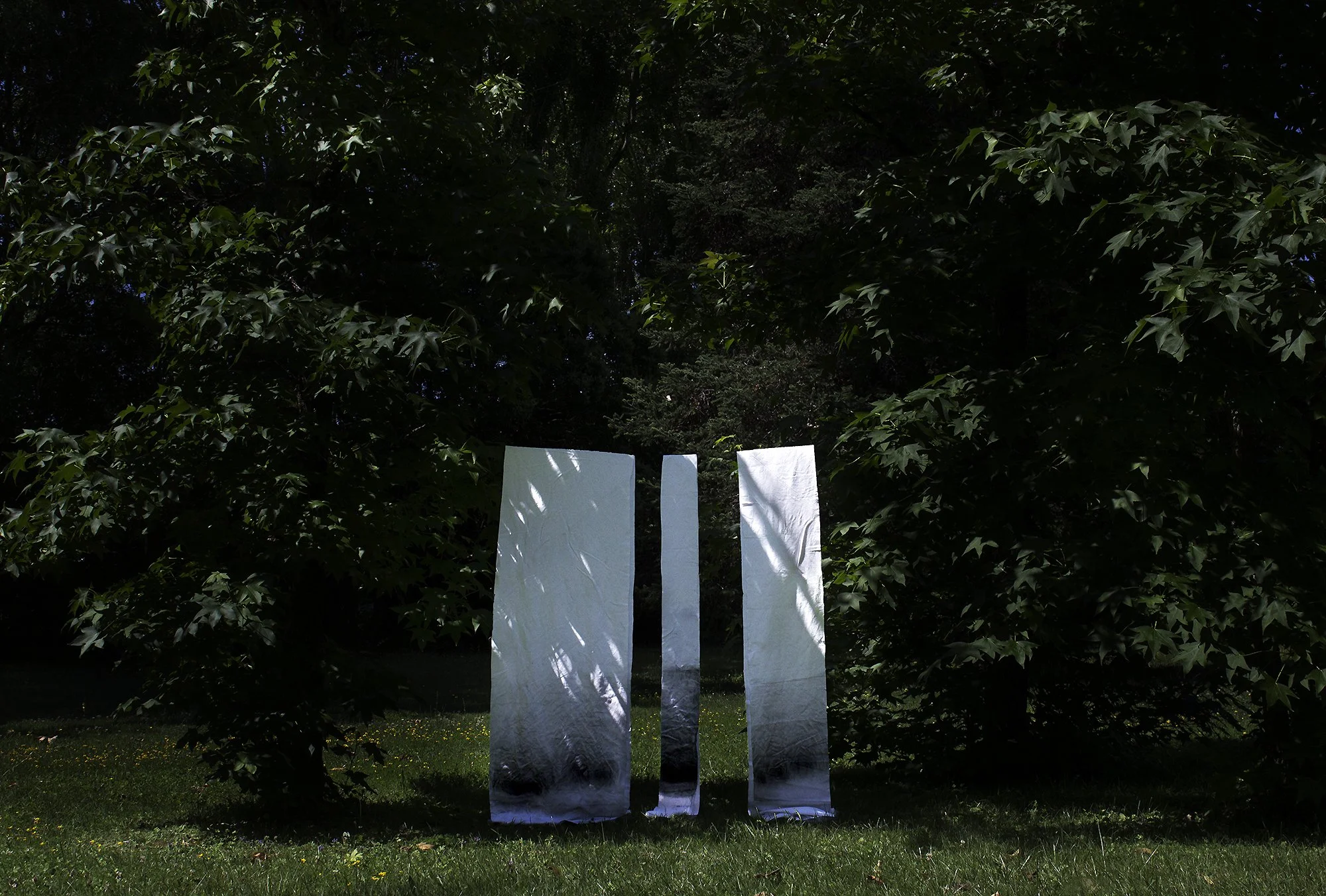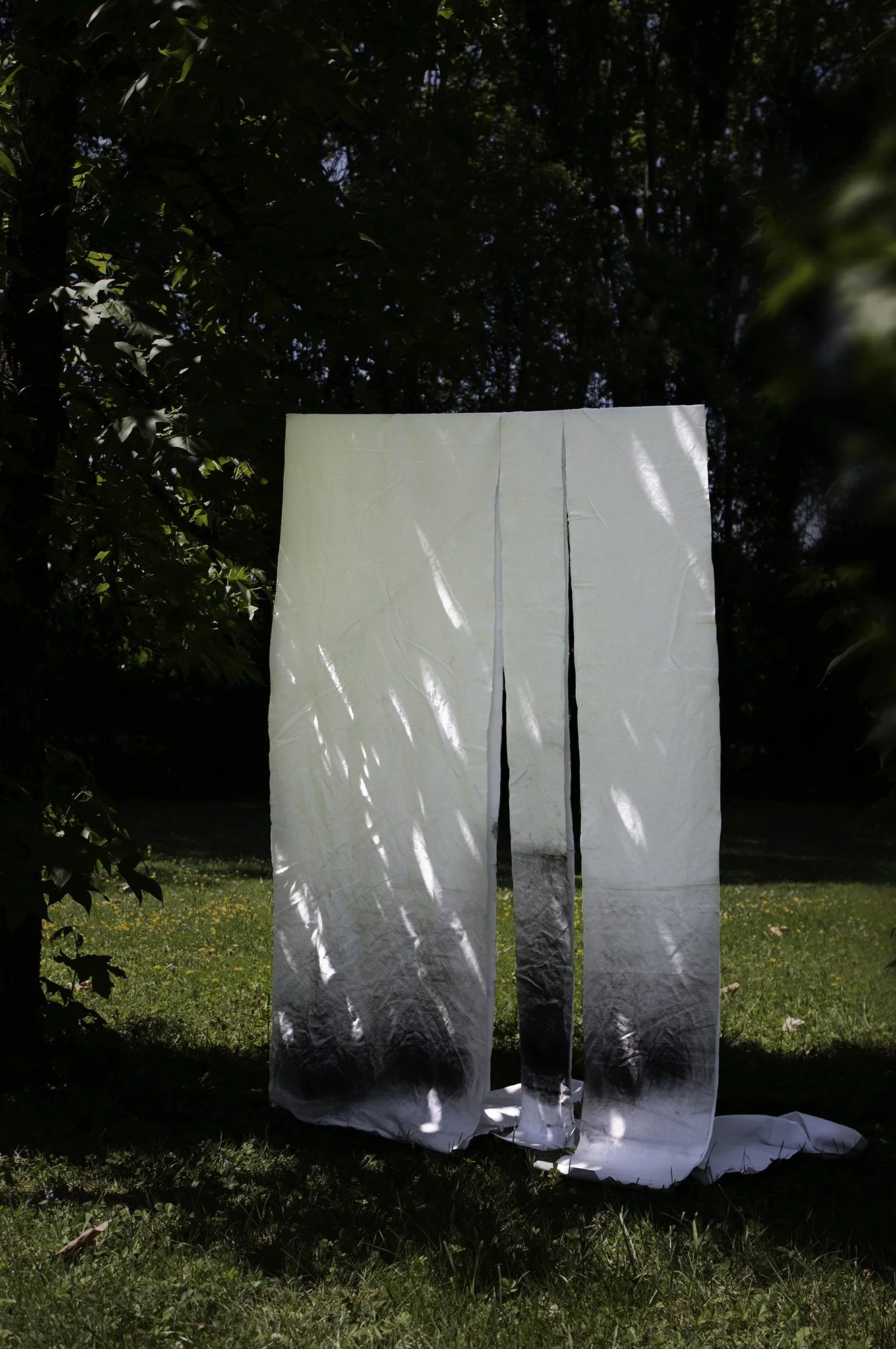 Ces draps tendus, comme autant de vestiges calcinés, sont les témoins tangibles du passage fugace d’une fumée lourde et étouffante. Les Tissus résiduels se dressent en travers du regard pour imposer leur funeste présage. Voiles mortuaires rescapés d’un drame personnel, ces reliques se heurtent tant au regard qu’aux alentours verdoyants qu’elles cotoient.
